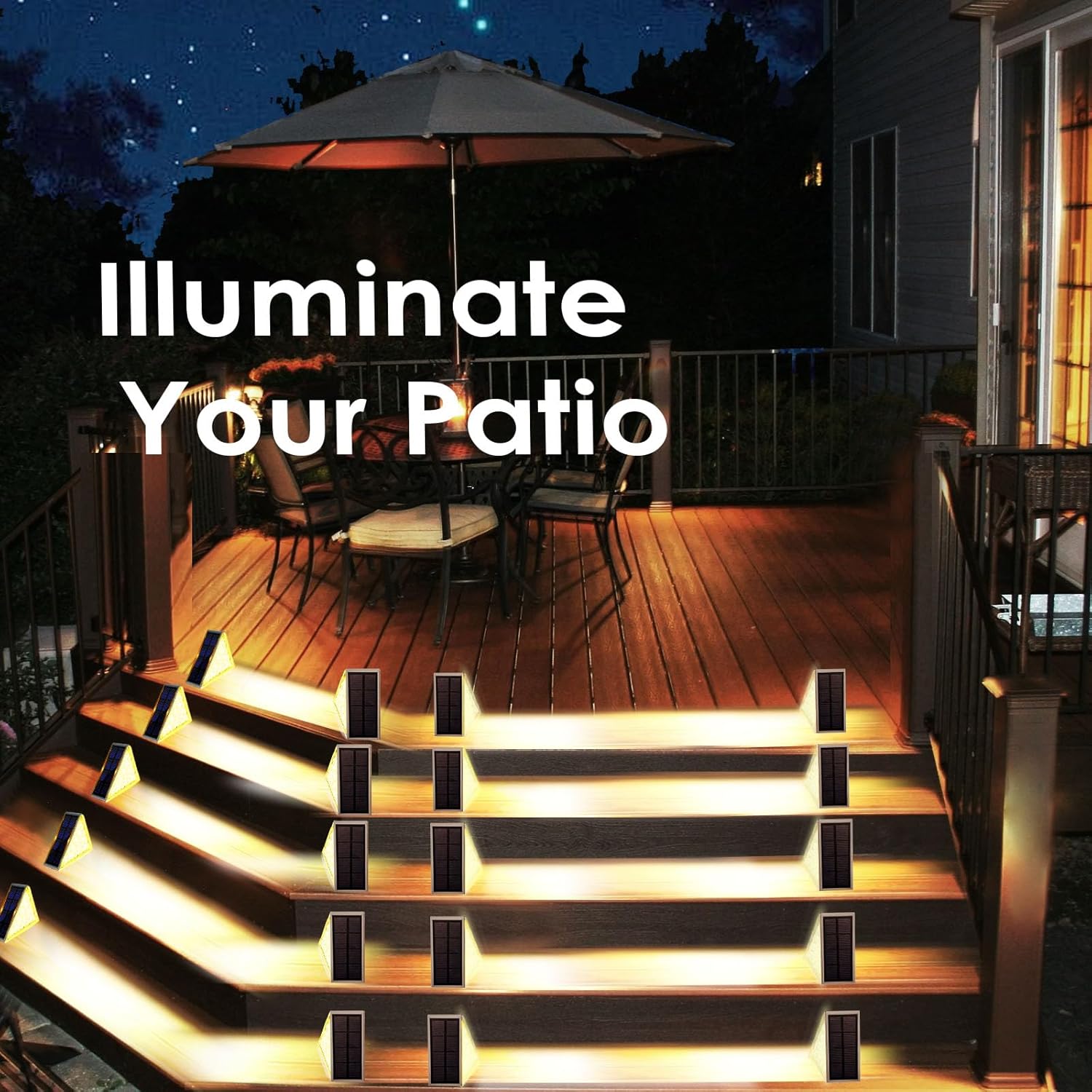 Efficient Solar Powered Lighting: These outdoor solar step lights harness solar power to illuminate your deck, stairs, and walkways. The LED lights charge during the day and automatically turn on at dusk, providing energy-efficient lighting.