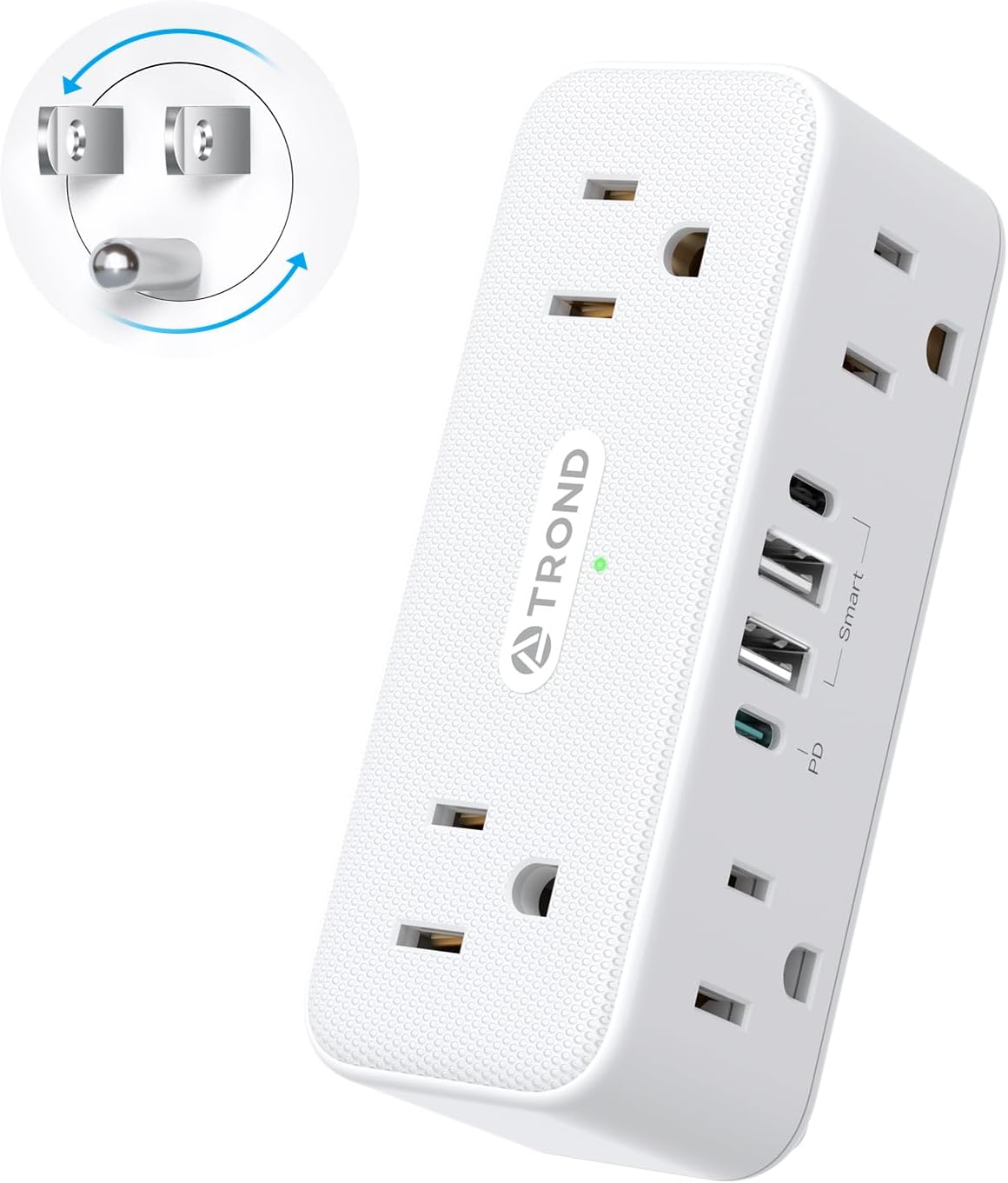 10-IN-1 Flat Outlet Expander: Equipped with 6 AC outlets, 2 USB-C ports, and 2 USB-A ports spread across 3 sides, this rotating power splitter enables simultaneous powering of up to 10 devices. The total power of the devices plugged in simultaneously cannot exceed 1875W.