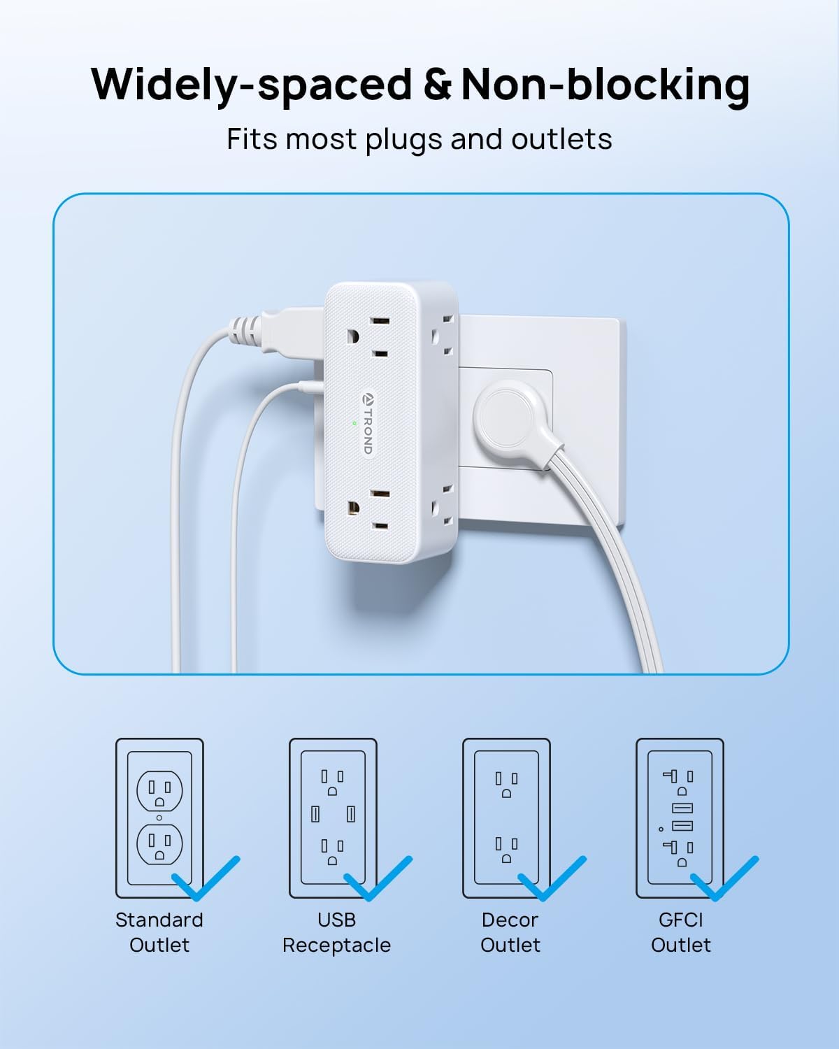 3 Way Widely-spaced Multi Plugs: The wall adapter features 2 plugs on each of its 3 sides, offering wider spacing between outlets to accommodate larger adapters and plugs without blocking adjacent outlets. This design provides ample space between outlets, facilitating easy access and movement of plugs, especially in small spaces or behind furniture.